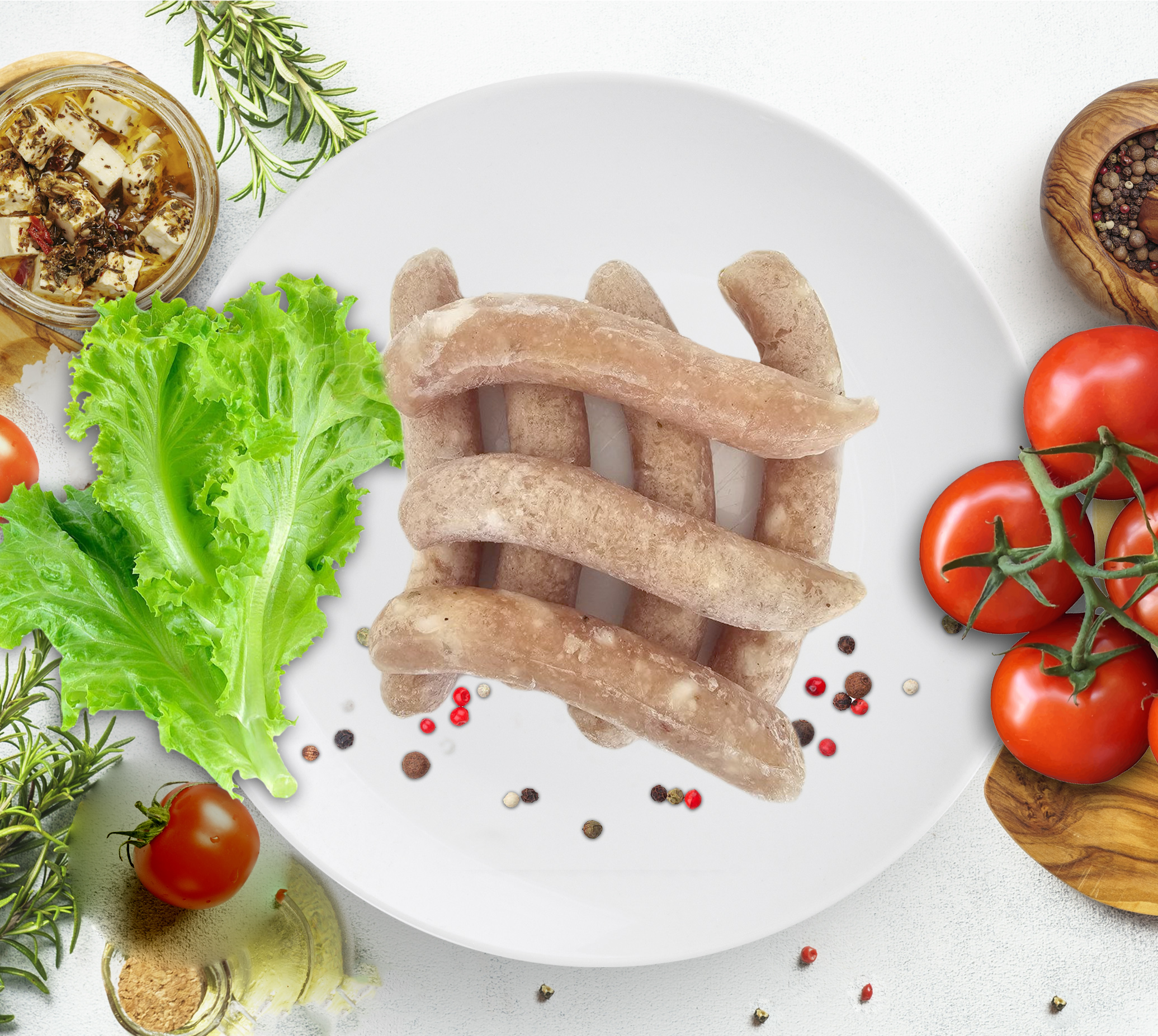 Состав: мясо кур и цыплят бройлеров (тушки и их части), сливки коровьи из цельного молока, смесь перцев, мускатный орех, картофельный крахмал, сахар, соль пищевая. Натуральная оболочка - баранья черева.