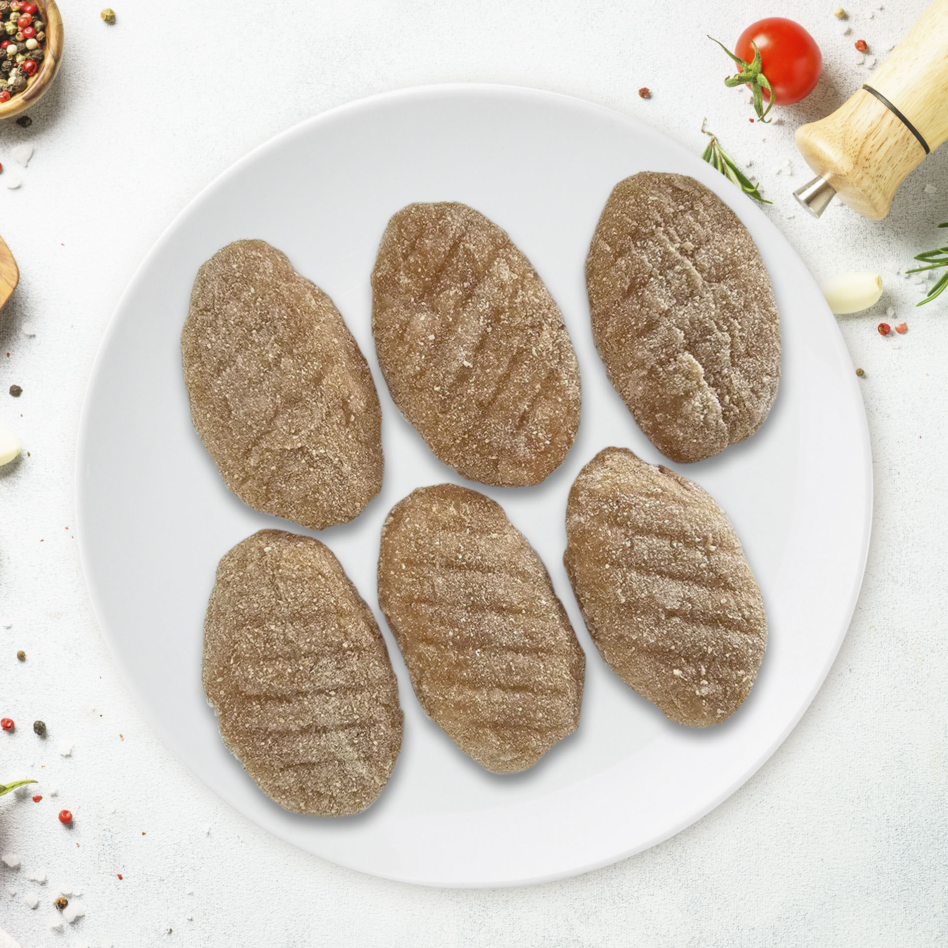 Состав: грудка куриная, лук репчатый, соль пищевая, чеснок сушеный, паприка, карри, перец черный молотый, яйцо куриное/цесариное, сухари панировочные, молоко сухое, мука цельнозерновая для придания формы котлетам.