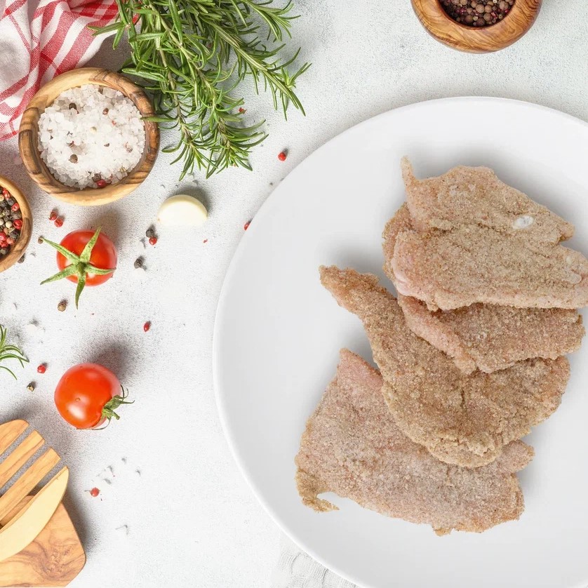 Состав: филе куриной грудки, соль пищевая, перец черный молотый, приправа хмели сунели, масло подсолнечное, мука пшеничная высшего сорта, яйцо куриное, сухари панировочные.