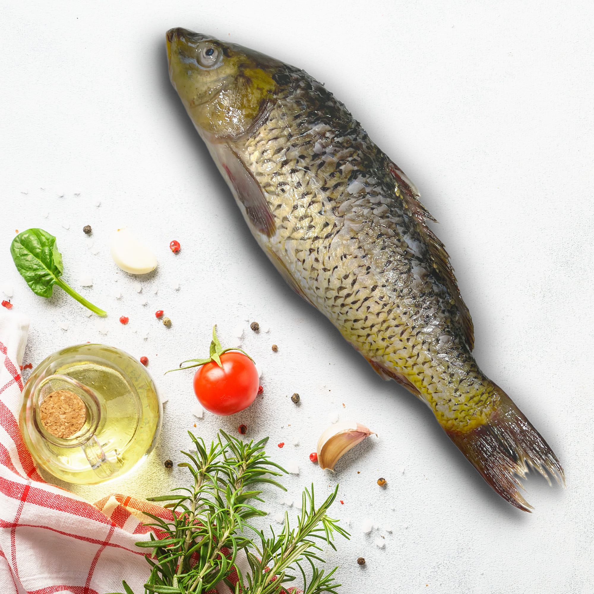 Чешуйчатый карп, выращенный на зерновом откорме в нашем пруду. Карп уже очищен от чешуи и внутренностей для вашего удобства.
